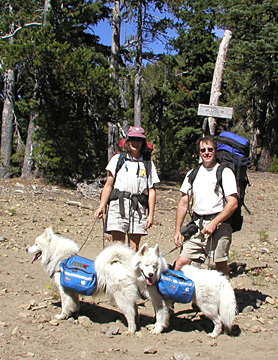 Here Linda and Lightning take a break on a fallen tree along the Pacific Crest Trail in southern Oregon. His loaded
