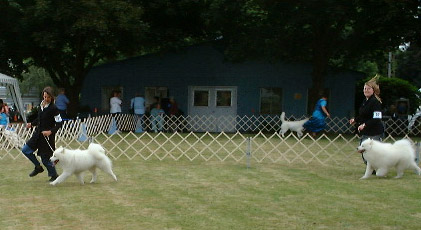 Lightning entered the 2001 Williamette Valley Samoyed Fanciers Specialty. A "specialty" is a dog show that focuses on a single breed. Since he has a title, he was qualified to compete in the Working Dog class, which is only occasionally offered at specialties for working breeds such as the Samoyed. Here are Linda and Lightning gaiting in the Working Dog class (we're the team in the lead).